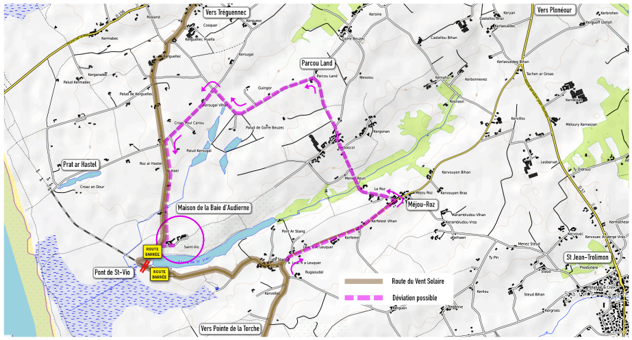 Afin de parvenir à rejoindre la Maison de la Baie d'audierne en venant du Sud, il convient donc (actuellement et pour une durée indéterminée), d'emprunter la déviation estivale mise en place au lieu-dit Méjou-Roz et les voies communales, comme décrit sur la carte ci-dessous, ou plus simplement, de passer par Tréguennec afin de minimiser le traffic routier sur ces petites routes communales, et d'assurer ainsi la tranquillité de l'ensemble des riverains.